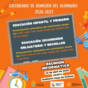 La Concejalía de Educación les invita a la charla informativa sobre el proceso de admisión para el curso escolar 2026/2027. En este encuentro se facilitará información relevante sobre los plazos, requisitos y procedimientos, y se podrán resolver las dudas que puedan surgir.