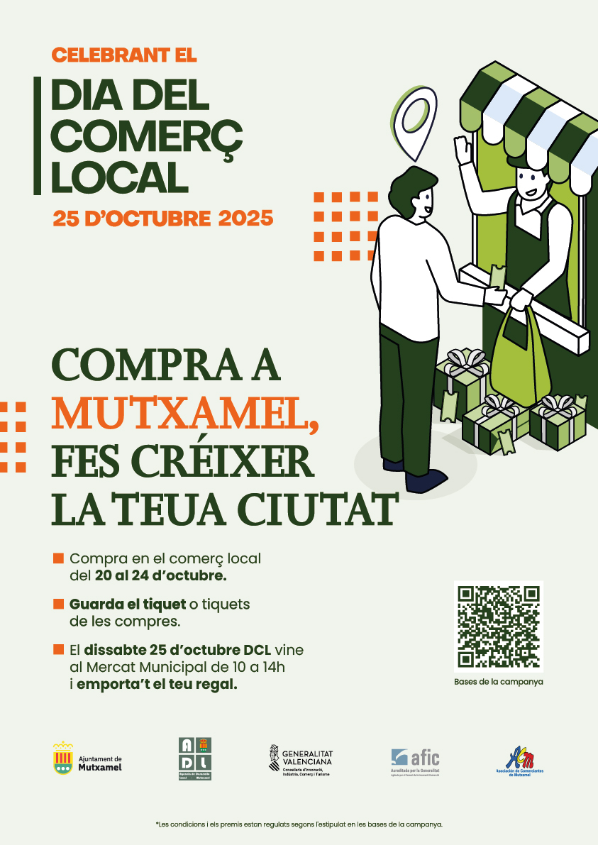 La campanya de promoció del comerç local “COMPRA A MUTXAMEL, FES CRÉIXER LA TEUA CIUTAT”, Celebrant el Dia del Comerç Local 25 d’octubre 2025, es realitzarà durant el període comprés entre el dilluns 20 i el dissabte 25 d’octubre de 2025, tots dos inclusivament.