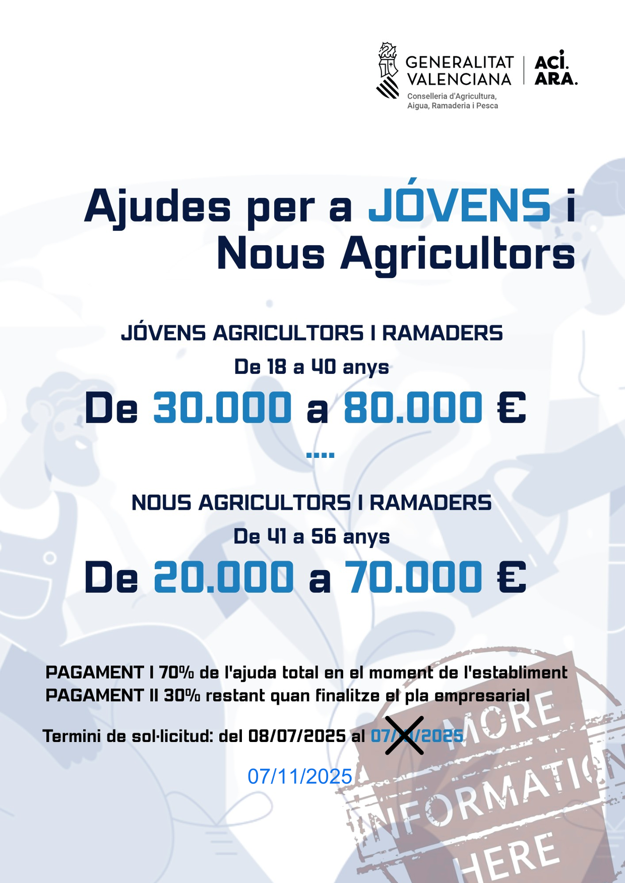 La Conselleria d’Agricultura, Aigua, Ramaderia i Pesca ha publicat recentment les Ajudes a Primera Instal·lació i Noves Incorporacions al sector agrari, destinades a persones joves agricultores i nous agricultors que s’incorporen al sector (o que ho hagen fet en els últims 24 mesos).