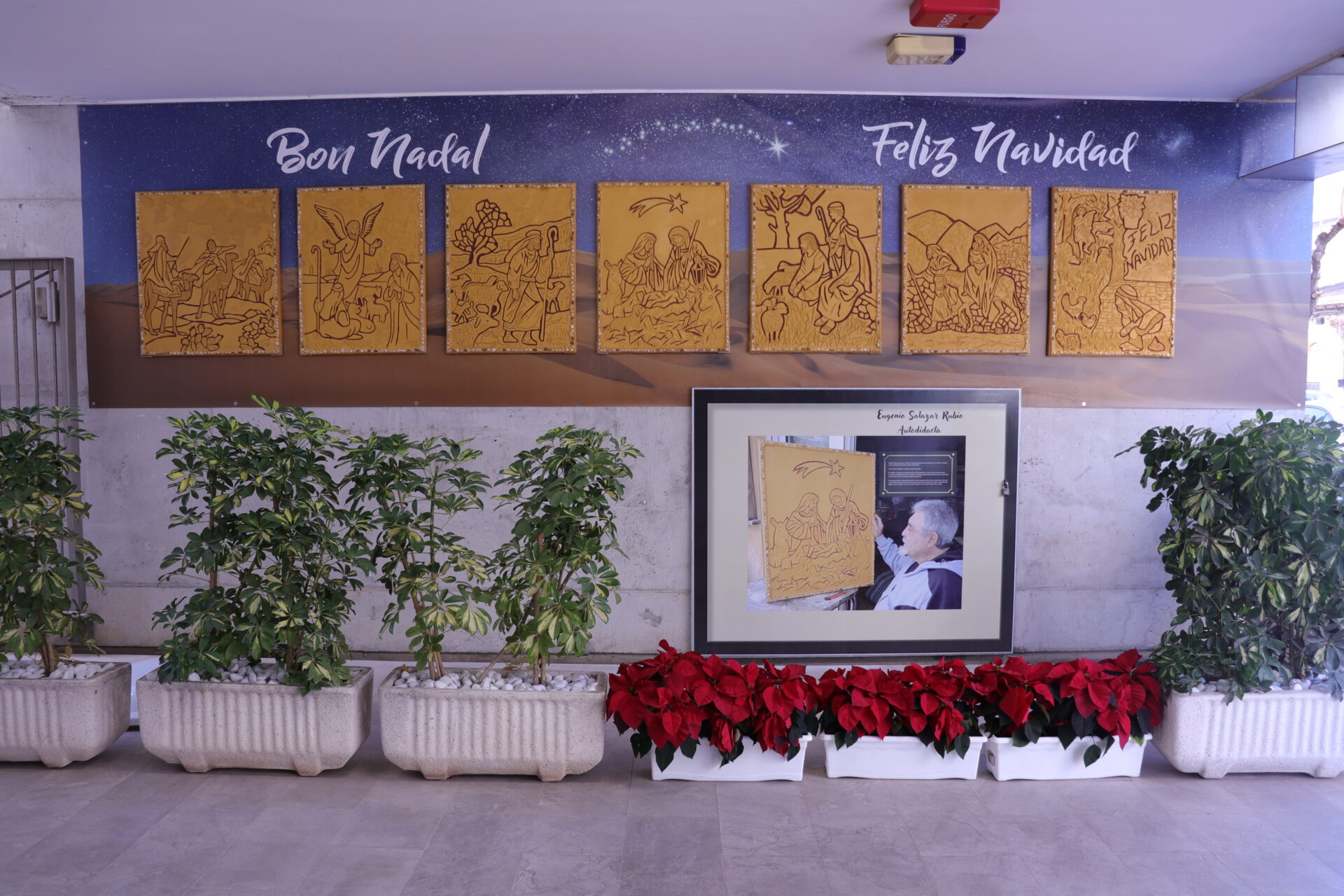 L’Ajuntament de Mutxamel ha volgut afegir, a la iconografia nadalenca que engalana la nostra localitat per a celebrar aquestes festes, la reproducció del naixement del xiquet Jesús que Arcadi Blasco va fer en els anys 70 del segle passat i que conserven algunes famílies del municipi. En concret, les figures que veurem enfront de la porta de l’ajuntament han pres com a model les que té M. Loreto García a la Casa d’Amanda Aracil, molt vinculada la família d’Arcadi i mestra de Costura i doctrina que va ensenyara moltes xiques joves com era costum, i representen la Sagrada Família amb Jesús acabat de nàixer en el pessebre amb el bou i l’ase, sense faltar l’àngel, que anuncia la bona nova. En el conjunt exposat es poden contemplar també reproduïdes les vidrieres que Arcadi va dissenyar per a la nostra església, en els anys cinquanta del segle passat, on destaquen l’àngel i l’espiga.