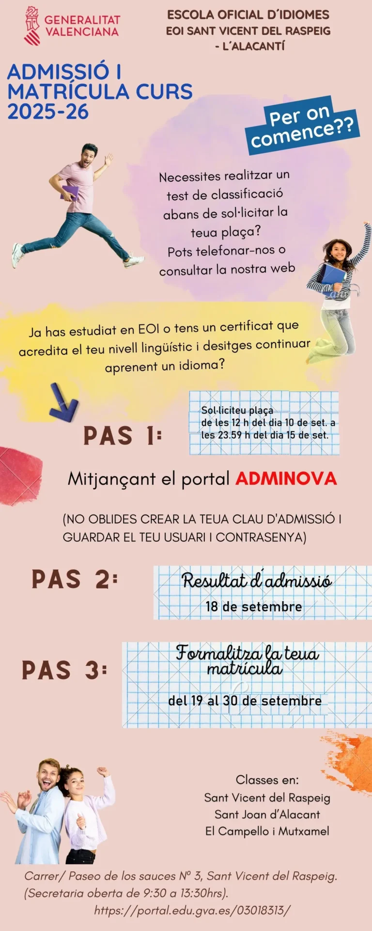 Més informació en l’EOI Sant Vicent del Raspeig. Horari Secretaria de dilluns a divendres de 9.30 a 13.30 h. Passeig dels Salzes, núm. 3, Sant Vicent del Raspeig. Tel. 689347688. Correu electrònic: 0318313@edu.gva.es.