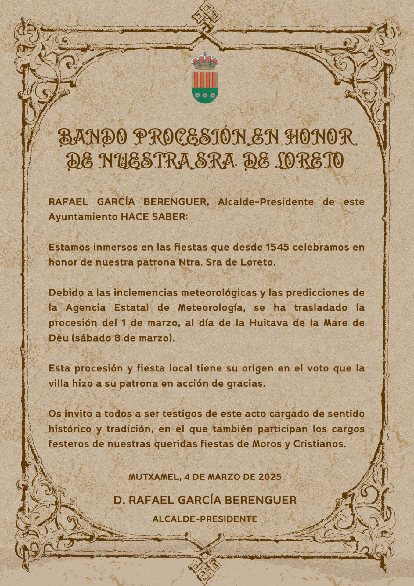 BAN D’ALCALDIA AMB MOTIU DE LES FESTES DE MOROS I CRISTIANS DE MUTXAMEL EN HONOR A LA MARE DE DÉU DE LORETO