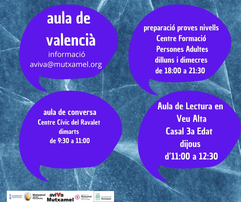 L’Agència de Promoció del Valencià de l’Ajuntament de Mutxamel en la seua tasca formativa a la ciutadania oferix els cursos per a preparar les proves de nivell de l’A1 al C2, els dilluns i els dimecres en el Centre de Formació de Persones Adultes, IES L’Allusser, C/ Tirant lo Blanc, 11, de 18:00 a 19:00 h, nivell A1; de 19:00 a 20:00 h, nivell A2-B1; de 20:00 a 21:30 h, nivell B2-C1-C2.