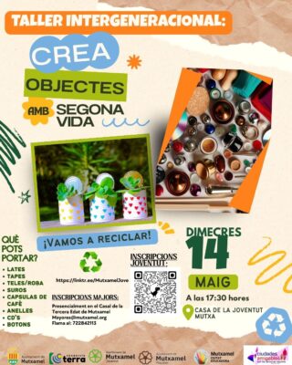 Aquest taller no sols és una oportunitat per a aprendre tècniques de reutilització de materials i creació d’objectes nous a partir d’elements reciclats, sinó també un espai per a teixir llaços entre generacions. Joves i majors treballaran braç a braç, compartint idees, riures i experiències mentre transformen taps, lates, càpsules, roba vella, CDs, botons, suros i molts altres materials en objectes únics i plens d’història.