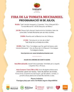 • 22h. Cata “Vins i formatges que fan gust de besos, amb tomata Mutxamel”: Vins de Ruta del Vi d’Alacant i Formatges Formatgeria Camp d’Elx.