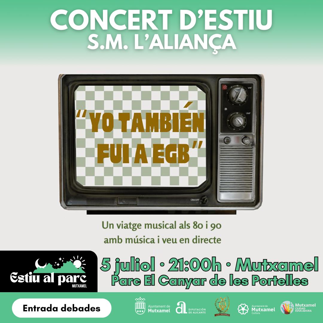 Dins de la programació cultural L’Estiu a Mutxamel, en el cicle Estiu al Parc, el pròxim 5 de juliol a les 21.00 h, el Parc El Canyar dels Portelles acollirà el concert d’estiu de S. M. L’Aliança, titulat “Yo también fui a EGB”.
