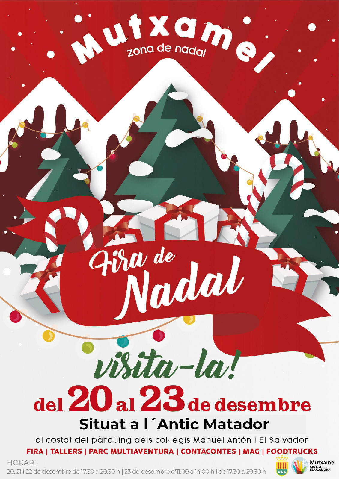 Veuen a gaudir del 20 al 23 de desembre de la Fira de Nadal en l’Antic Escorxador, en la zona de pàrquing dels col·legis Manuel Antón i El Salvador. Hi haurà tallers, contacontes, màgia, foodtrucks i molt més…
