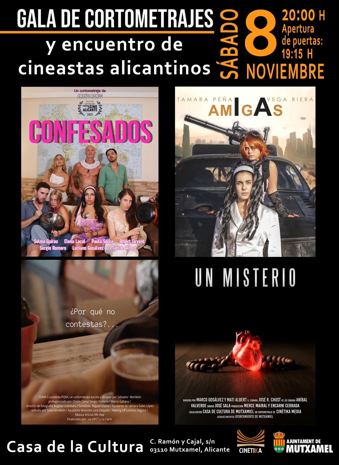 L’Ajuntament de Mutxamel et convida a gaudir d’una nit dedicada al talent audiovisual de la nostra província.Durant la gala es projectaran els curtmetratges Confesados, Amigas, ¿Por qué no contestas?… i Un misterio, (obra patrocinada per l’Ajuntament de Mutxamel).Una oportunitat única per conéixer els cineastes alacantins i gaudir del millor cinema en format curt.