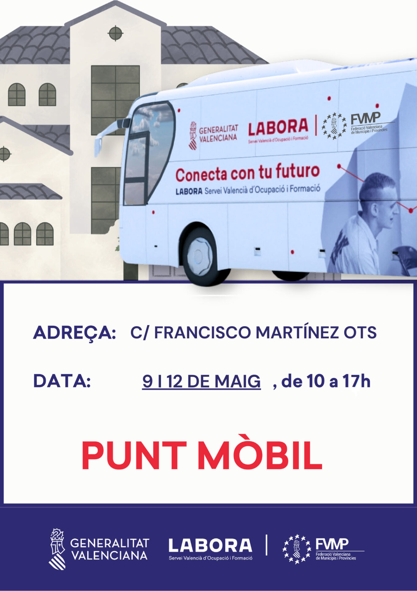El Punt Mòbil de LABORA, el Servici Valencià d’Ocupació i Formació, estarà de nou a Mutxamel per a oferir orientació laboral personalitzada a la ciutadania sense necessitat de desplaçar-se a altres municipis.