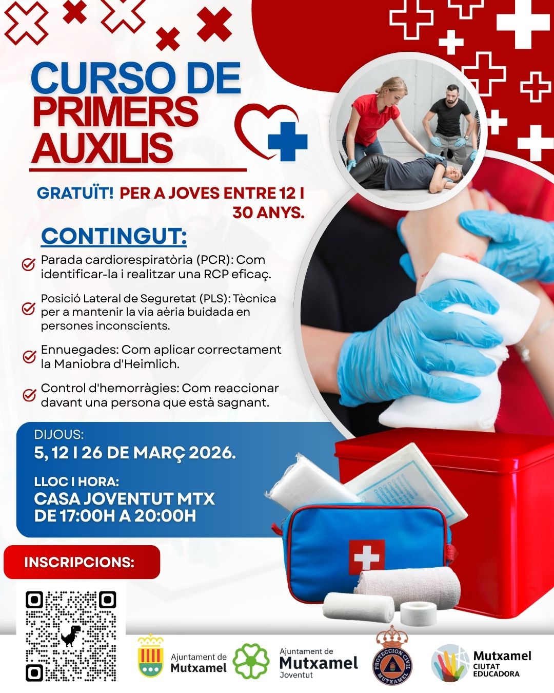La Casa de la Joventut de Mutxamel serà l’escenari, durant el mes de març de 2026, d’un curs gratuït de primers auxilis dirigit a joves d’entre 12 i 30 anys, una iniciativa organitzada per Protecció Civil de Mutxamel amb l’objectiu de dotar a la joventut del municipi de coneixements i habilitats bàsiques per a actuar amb rapidesa i eficàcia davant situacions d’emergència.