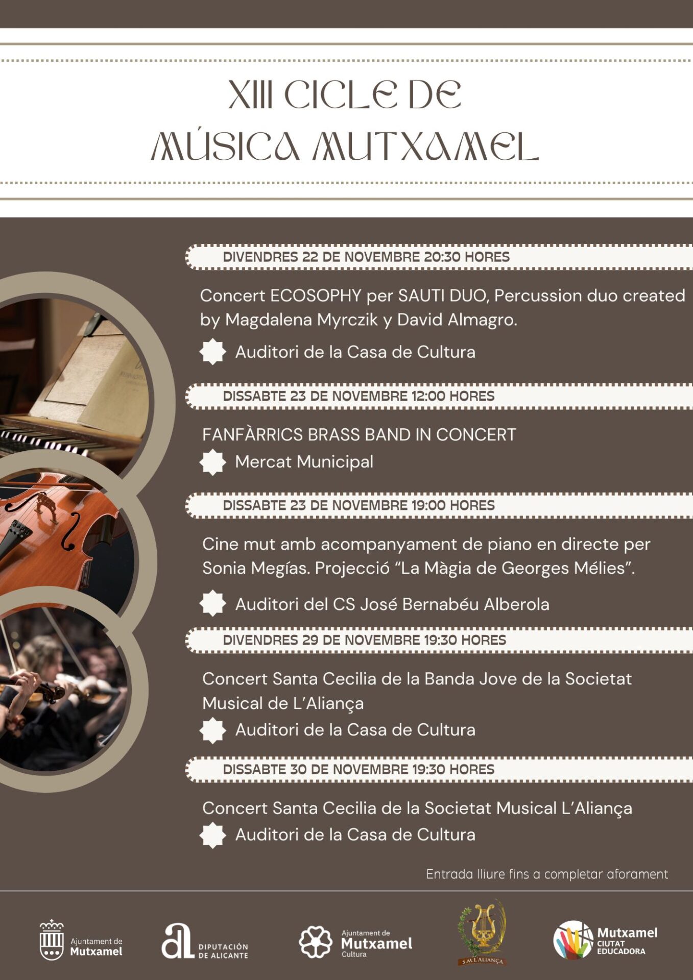 La XIII edició del Cicle de Música Mutxamel, arriba com cada any emmarcat en la festivitat de la patrona de la música, Santa Cecilia. El programa d’activitats culturals, ofereix diferents actuacions en les quals es posa de manifest la diversitat d’aquesta disciplina cultural. S’iniciarà el 22 de novembre i fins al 30 de novembre inclou un total de cinc concerts de diverses tipologies.