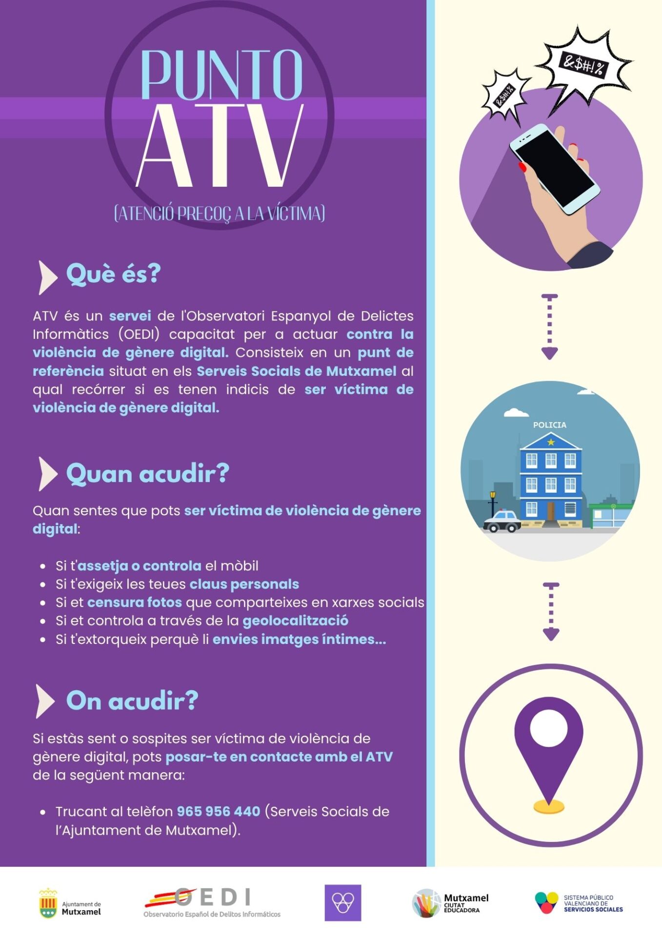La Unitat d’Igualtat de l’Ajuntament de Mutxamel ha llançat un nou impuls a la seua campanya de sensibilització i suport contra la violència de gènere digital, centrant els seus esforços a donar major visibilitat i accessibilitat al Punt d’Atenció Inicial a la Víctima, conegut com a Punt ATV, un servici clau per a oferir ajuda immediata a dones que patixen violència en entorns digitals. Es tracta d’un servici de l’Observatori Espanyol de Delictes Informàtics, capacitat per a actuar contra la violència de gènere digital.