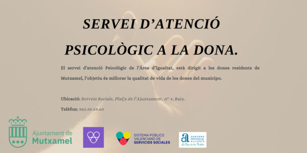 La Regidoria d’Igualtat compta amb un servei d’Atenció Psicològica per a les Dones de Mutxamel. Aquest servei es troba dLa Regidoria d’Igualtat compta amb un servei d’Atenció Psicològica per a les Dones de Mutxamel. Aquest servei es troba dirigit a les dones del municipi que són derivades per a poder fer front a situacions conflictives de violència, ruptura emocional, acompanyar-los en la presa consciencia de situacions de dependència emocional nociva en una relació de parella, restructurar traumes de situacions de violència de gènere.