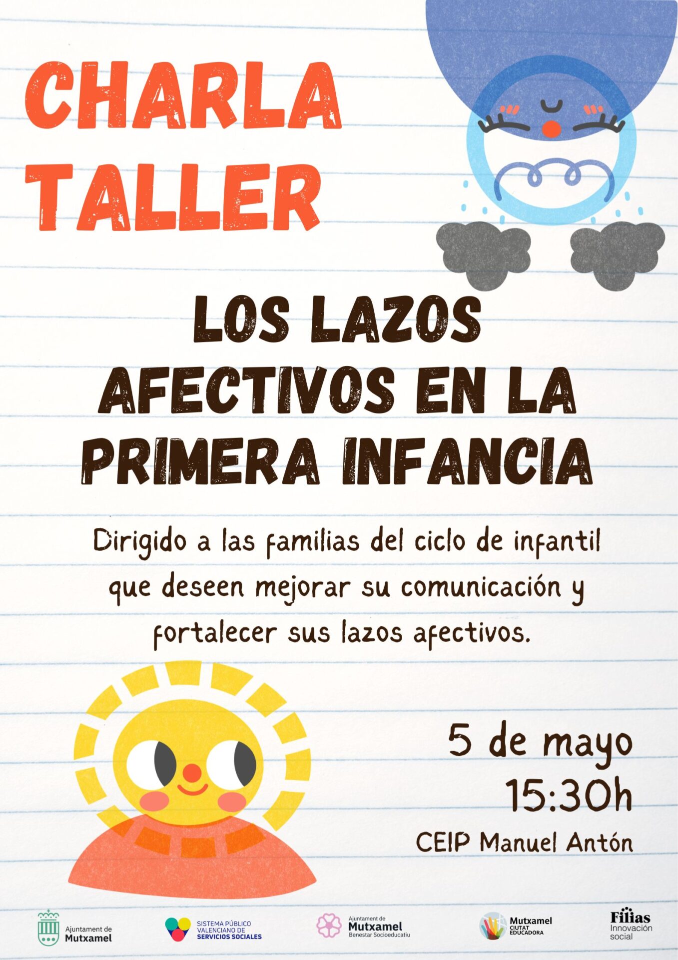 El próximo 5 de mayo a las 15:30 h, se celebrará en el CEIP Manuel Antón la charla-taller «Los lazos afectivos en la primera infancia», dirigida a las familias del ciclo de Educación Infantil.