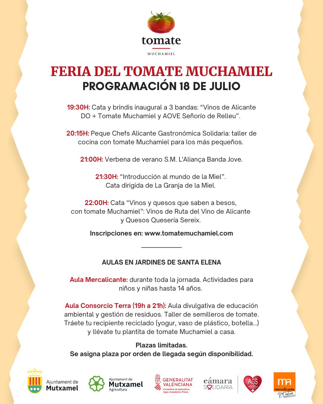 Mutxamel celebra una nueva edición de la Feria del Tomate Muchamiel, un encuentro con sabor local, producto de proximidad y actividades para toda la familia. La programación del viernes 18 de julio llega repleta de catas, talleres, música y propuestas gastronómicas únicas.