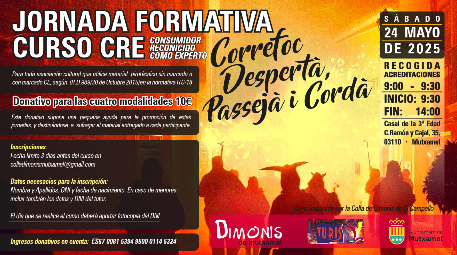 El Ayuntamiento de Mutxamel, en colaboración con la Colla de Dimonis de El Campello, organiza una jornada formativa para la obtención del certificado CRE (Consumidor Reconocido como Experto), necesario para el uso responsable de material pirotécnico en actos festivos.