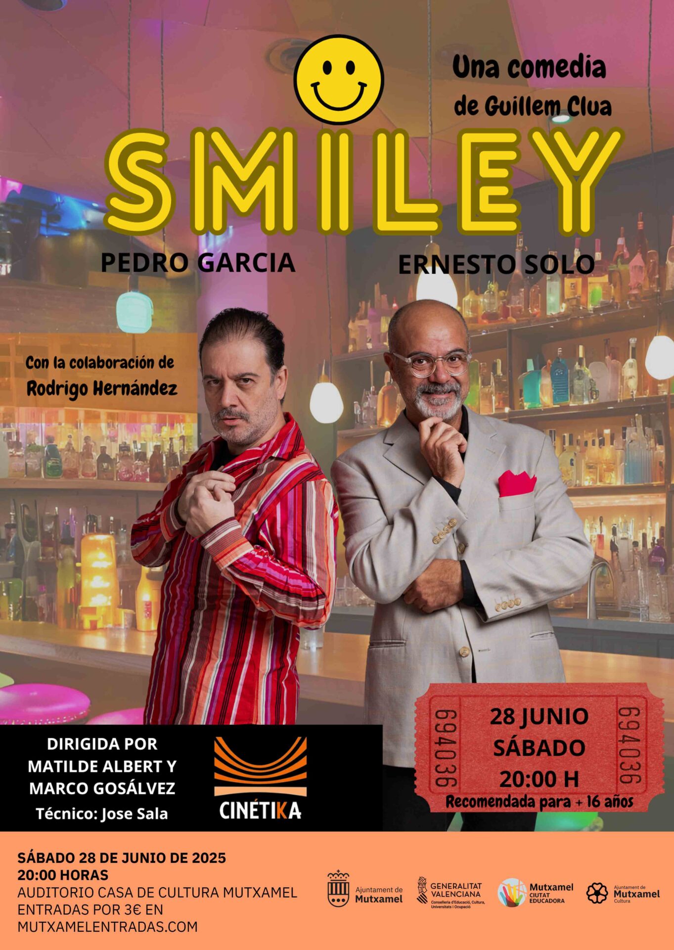 El próximo sábado 28 de junio a las 20:00 h, el Auditorio de la Casa de Cultura de Mutxamel acoge la representación de SMILEY, una comedia contemporánea presentada por la compañía Cinetika.